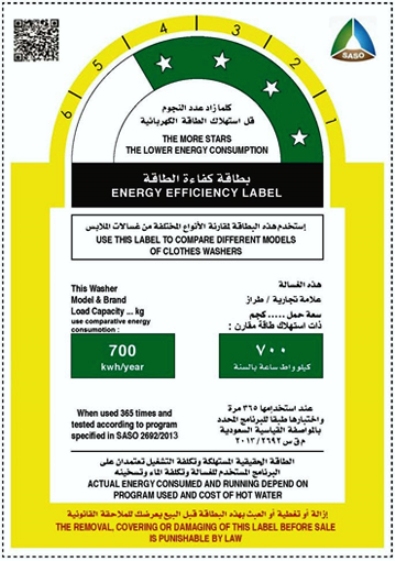 - SASO 2885 for washing machines – requirements of energy performance, water consumption, and labeling;